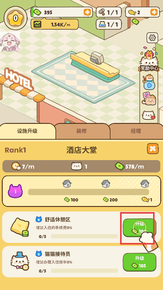 2、升级舒适休憩区,提升酒店设施等级,增加入住手续费,提升酒店收益。