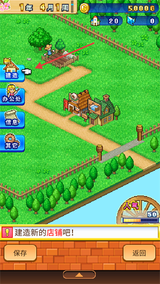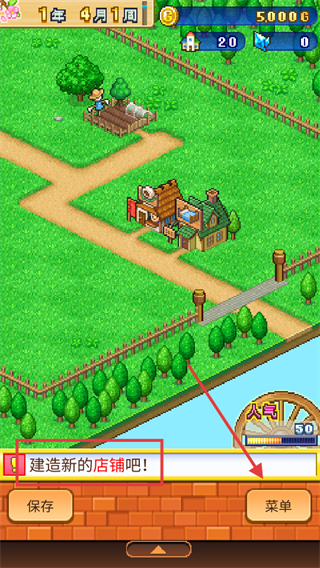 3、根据提示【建造新的店铺吧!】,点击【菜单】按钮,进入店铺建造界面,规划冒险村的商业布局。