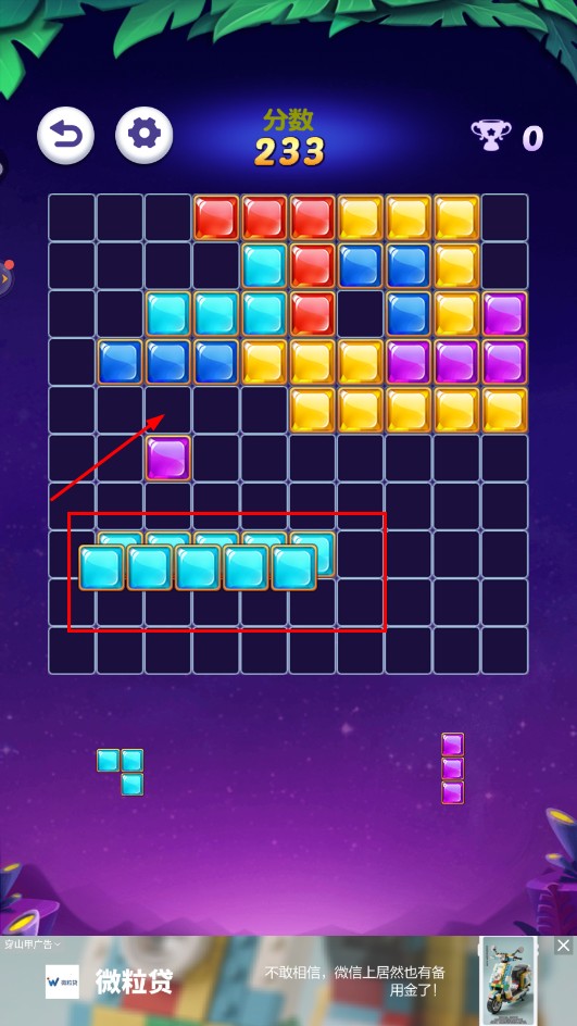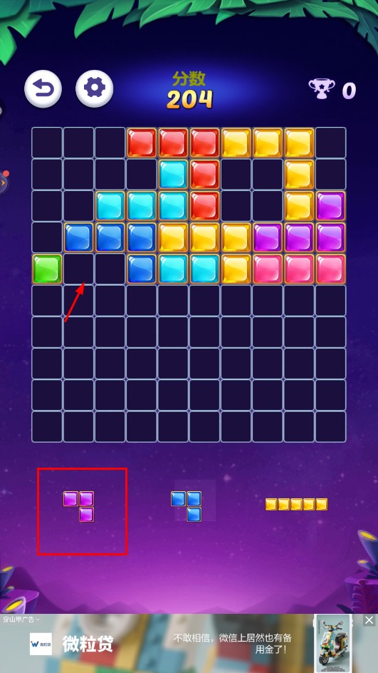 2、拖动紫色方块,放入上方网格对应空位,尝试拼凑同色方块。