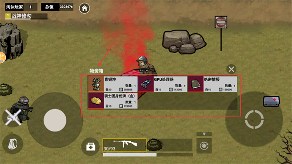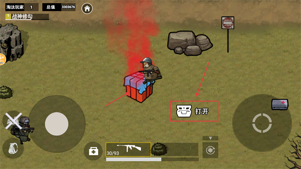 1、遇到带【打开】按钮的物资箱时,点击按钮获取资源,同时关注武器【30/93】状态,做好后续战斗准备。