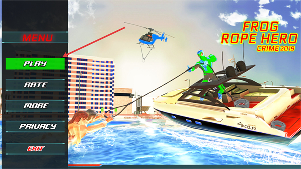 1、在游戏主界面,点击【PLAY】进入青蛙绳索英雄的犯罪冒险世界,开启城市探索和战斗之旅。