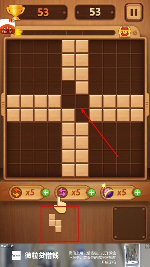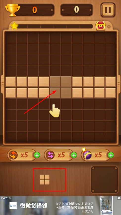 1、拖动下方方块,放入上方网格,使其两排消除。