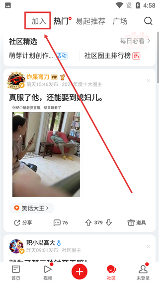 2、进入社区页面后,点击顶部【加入】选项,即可进入圈子选择页面,准备加入感兴趣的社区圈子。