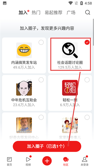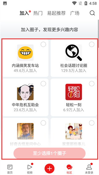 3、在圈子选择页面,可看到多个兴趣圈子选项,需至少选择1个圈子,点击圈子对应的选择框即可选中。