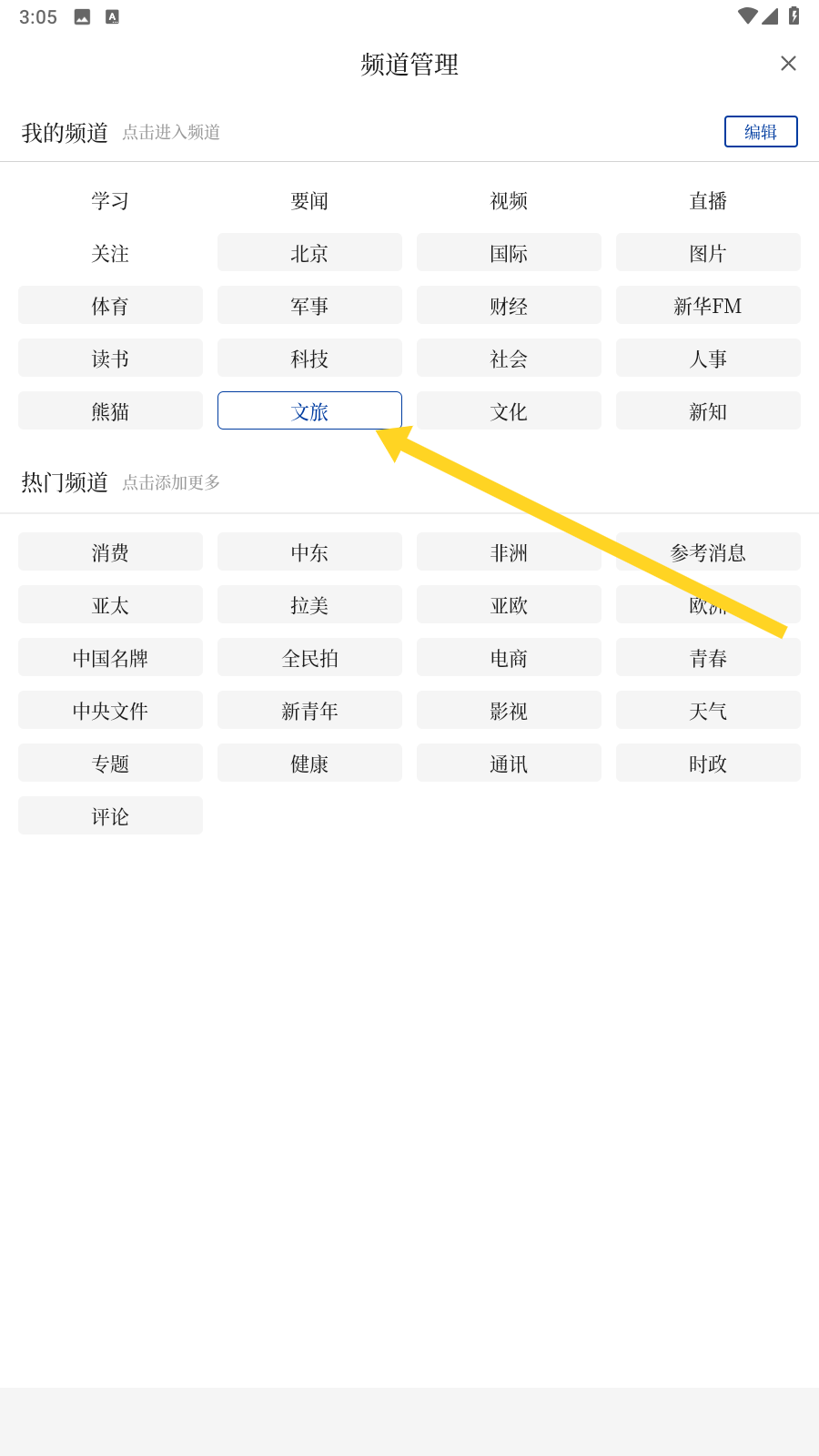 2、在频道管理页面,找到【文旅】频道并点击,筛选查看文旅类新闻啦。