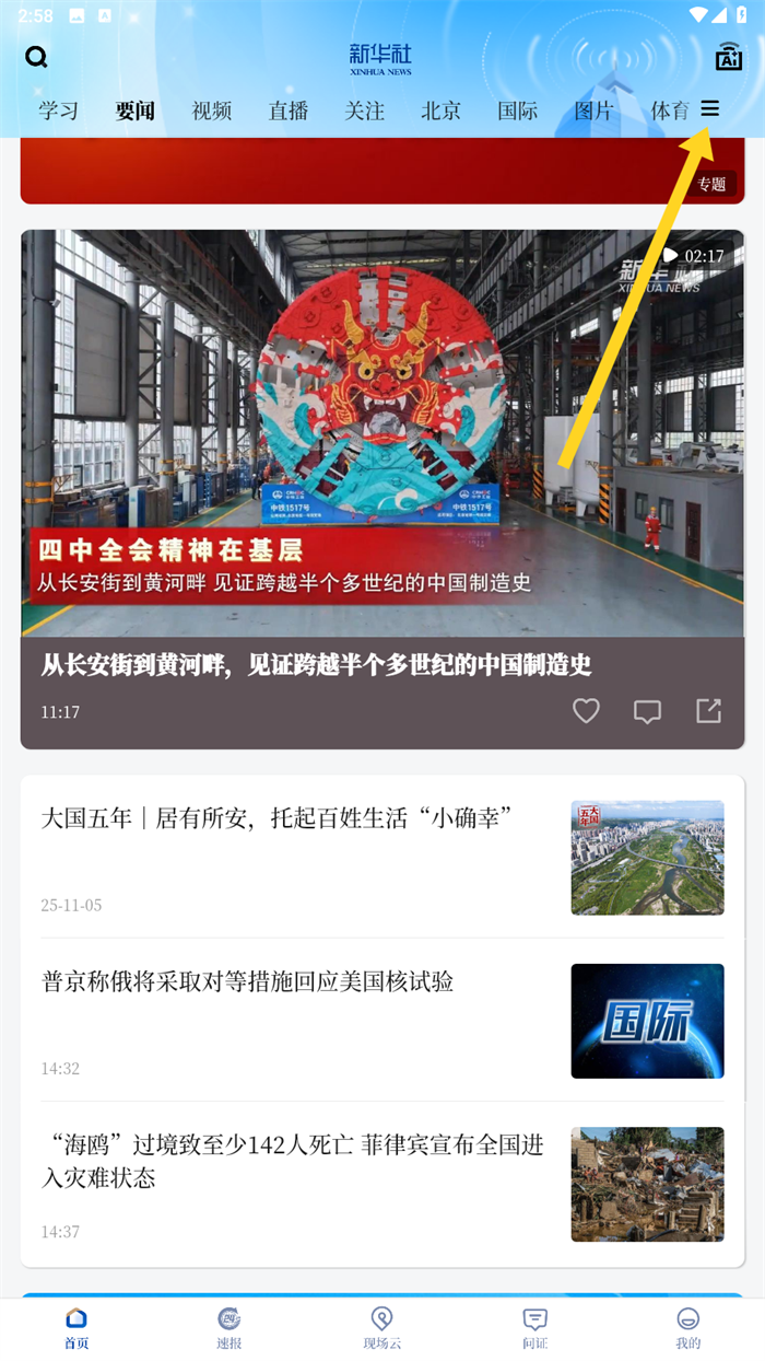 1、在新华社首页,点击右上角三横线菜单,进入频道管理页面哦。