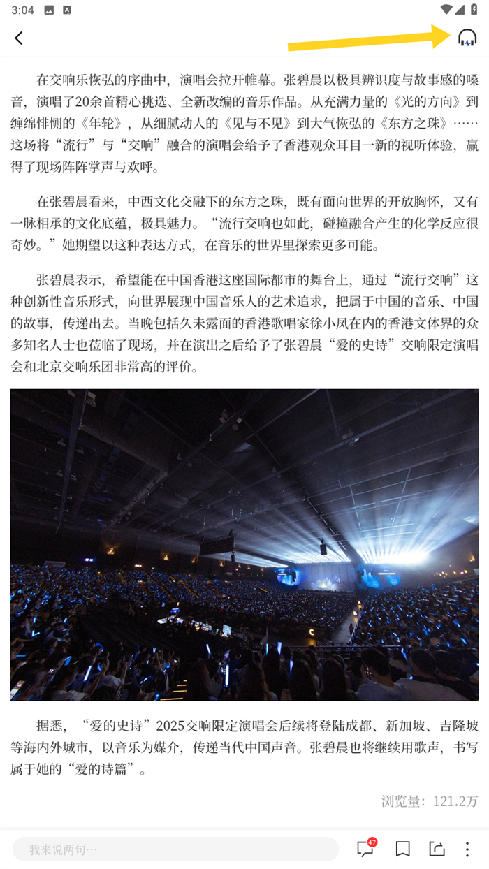 4、在新闻详情页,点击右上角耳机图标,就能以音频形式收听新闻,让新闻阅读更具趣味性哦。