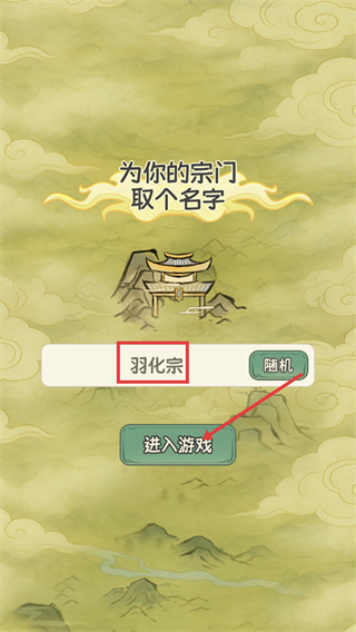 1、在“为你的宗门取个名字”界面,输入宗门名称,点击【进入游戏】按钮,即可开启宗门养成玩法。