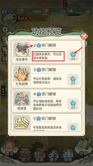 2、宗门星级提升可解锁对应功能,2星解锁“突发事件”,3星解锁“打熬筋骨”等,每类功能解锁需消耗20水晶,助力宗门资源与战力提升。
