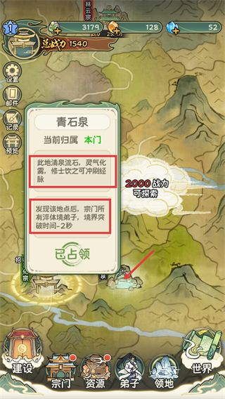 3、占领“青石泉”后,宗门所有淬体境弟子的境界突破时间将减少2秒,有效提升突破效率,该领地的灵气属性可直接作用于弟子养成。