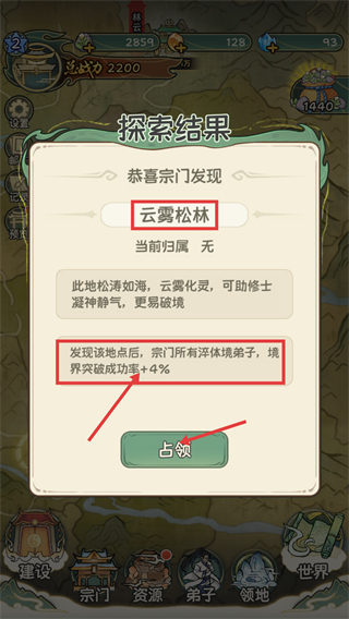 4、探索获得“云雾松林”后,点击【占领】可将其归入本门,使宗门淬体境弟子的境界突破成功率增加4%,持续探索领地并占领。