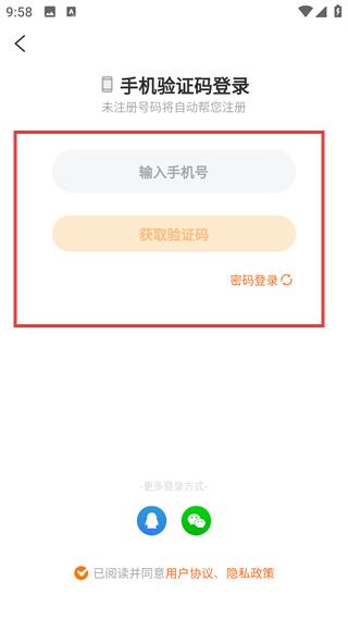 4、选择手机验证码登录后,输入【手机号】,点击【获取验证码】,未注册账号会自动完成注册。