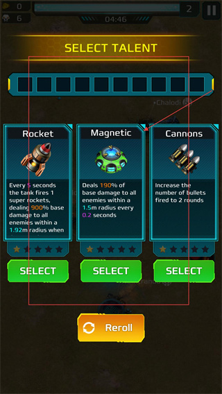 2、升级后进入【SELECT-TALENT】界面,可选择【Rocket】【Magnetic】【Cannons】三类天赋,点击【SELECT】装配。