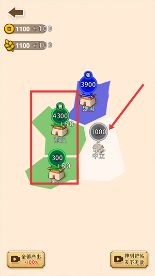 1、进入游戏后,长按方框内【蜀汉】区域进行占领箭头所指【中立】区域。