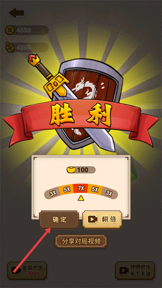 4、达成胜利后,点击【确定】领取【100】奖励。