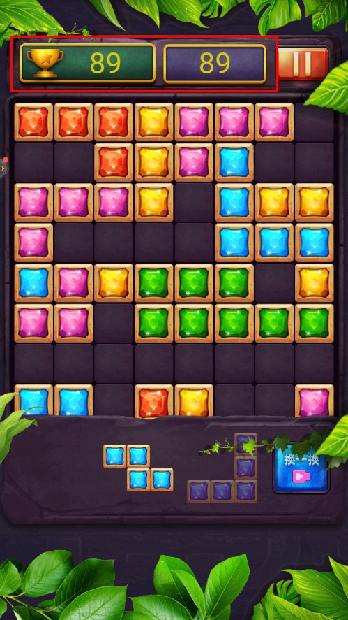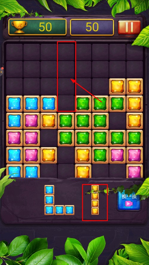 2、拖动下方长方形形状的宝石方块,放入上方网格使下方横排消除。