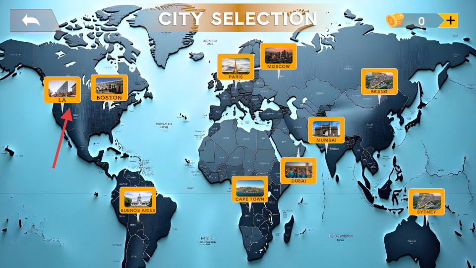 2、在世界地图中选择要驾驶的城市,不同城市有不同的驾驶场景和挑战。