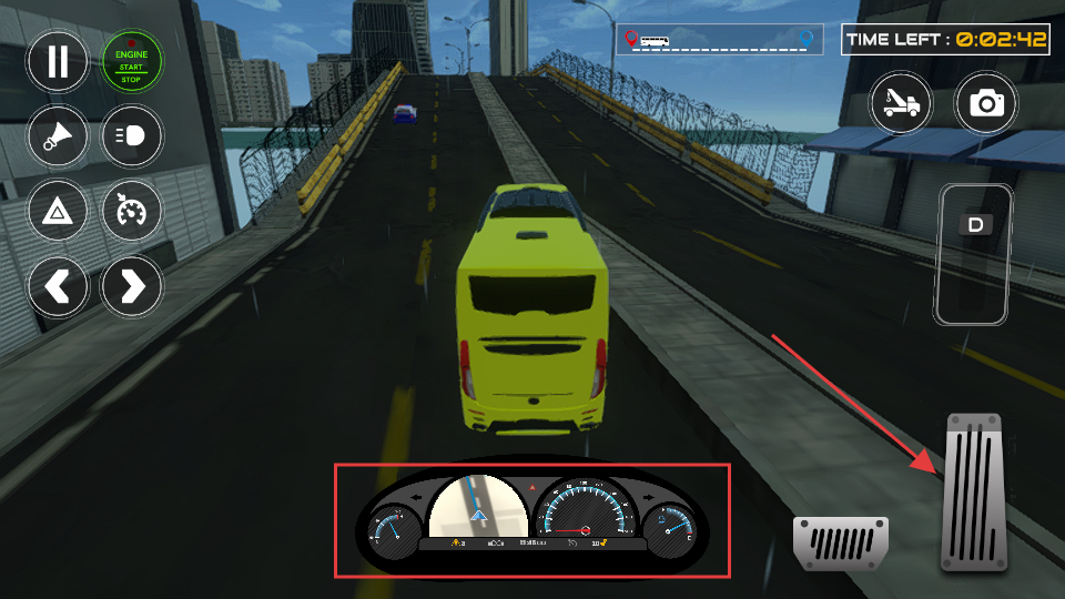 4、利用油门踏板控制车速,通过仪表盘观察车辆状态,在规定时间内驾驶巴士完成任务,安全驾驶。