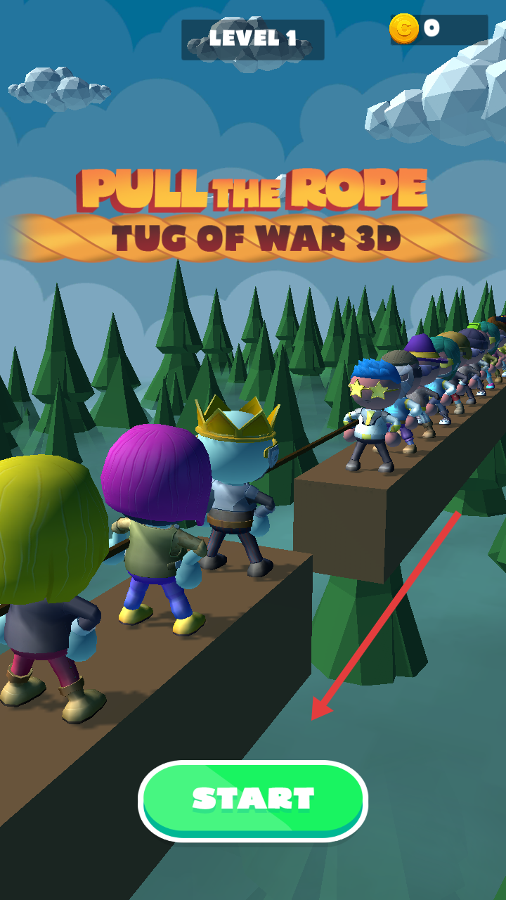 1、点击START按钮开始游戏,在森林场景的拔河挑战中,操控己方队伍开启与敌方的拔河对决。