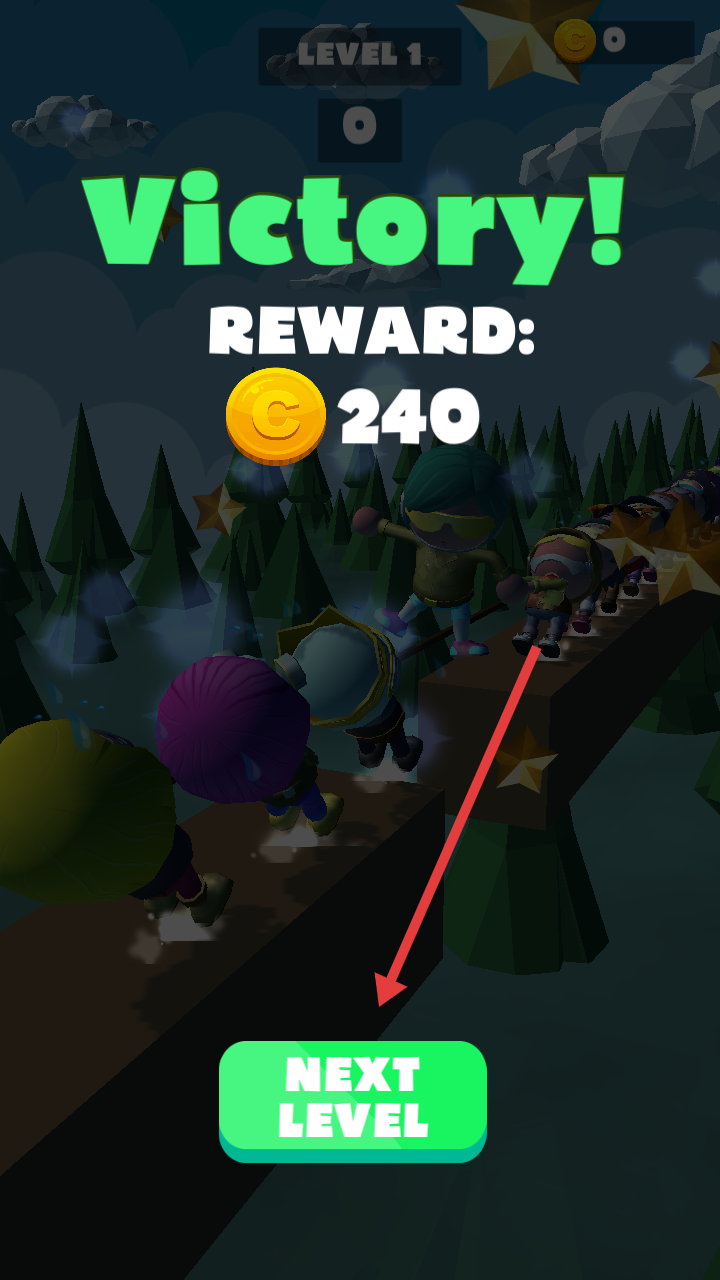 4、胜利后点击NEXTLEVEL按钮进入下一关,继续挑战更多森林场景的拔河关卡,积累金币奖励。