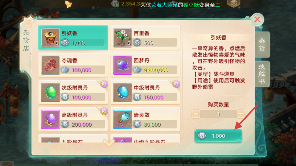 1、捕捉召唤兽前,需先在杂货店购买【引妖香】。