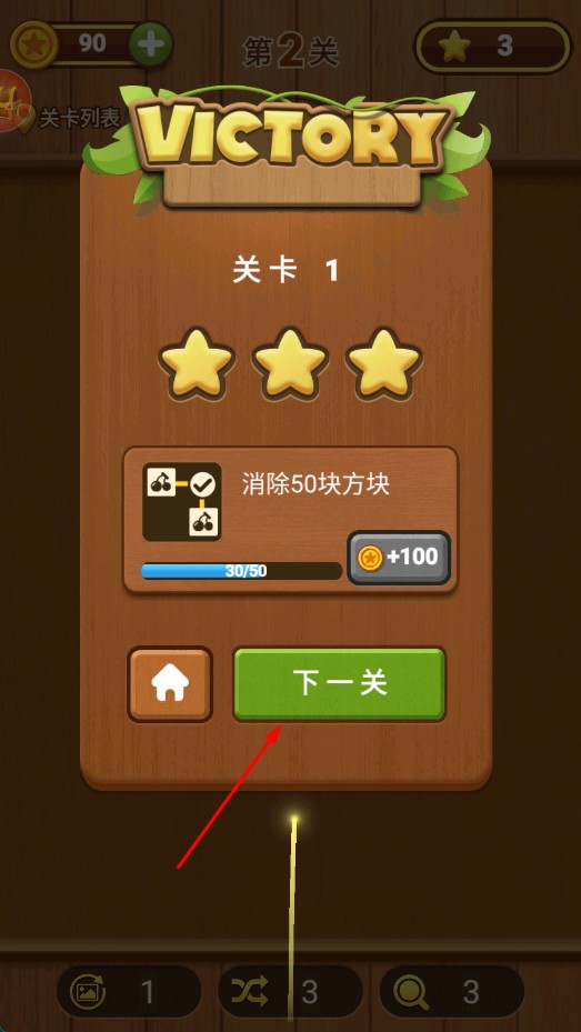 4、成功消除方块,达成关卡目标后,点击【下一关】,继续挑战新关卡,冲击更高分数与星级。