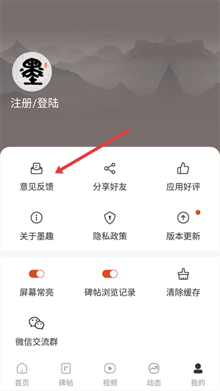 2、进入“我的”页面后,点击【意见反馈】选项。