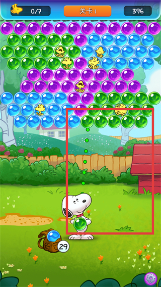 2、切换【绿色泡泡】后,对准上方聚集的绿色泡泡群发射,借助消除连锁提升分数,同时留意剩余泡泡数量【29】。