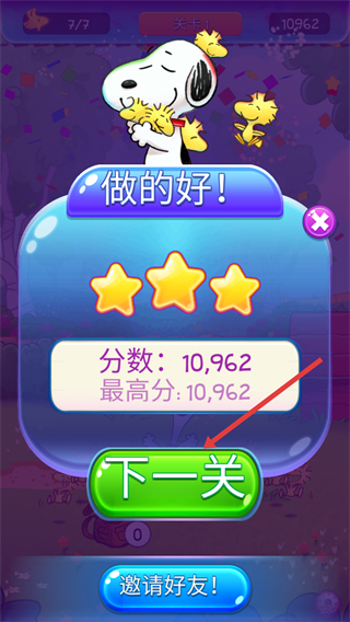 4、通关后获得三星评价,查看【分数:10,962】与最高分,点击【下一关】按钮可继续挑战新关卡。