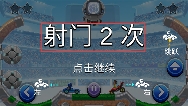 1、根据提示“射门2次”,明确关卡目标,点击继续进入游戏场景,开启战车足球竞技挑战。
