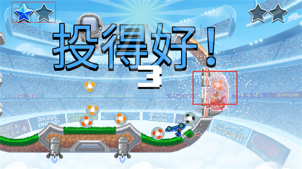 3、精准操控战车,将足球射入球门,完成射门任务,获取“投得好!”的评价,积累游戏分数。