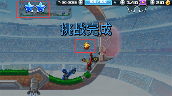 4、完成挑战后,获取金币奖励,用于升级战车和解锁新关卡,提升战车足球竞技的整体水平。
