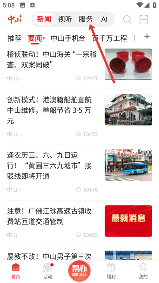 1、在中山Plus软件,点击顶部【服务】标签,方便我们找到办事预约功能呢。
