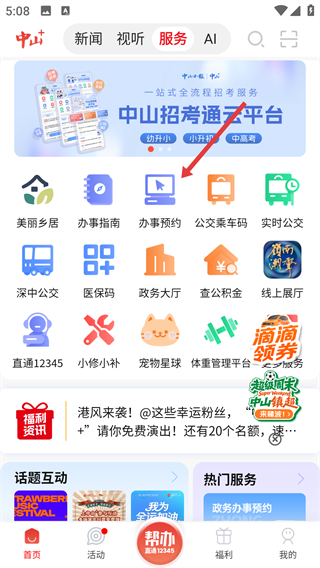 2、在服务板块,我们点击【办事预约】图标,进入云预约界面,正式开启办事预约流程呀。