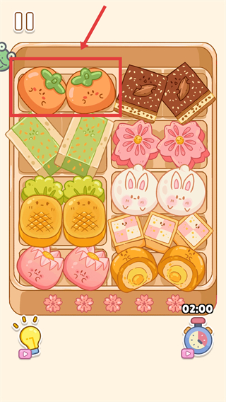 1、在消除关卡界面,匹配相同样式的点心(如框选的柿子造型),同时留意底部【02:00】倒计时,推进关卡进度。