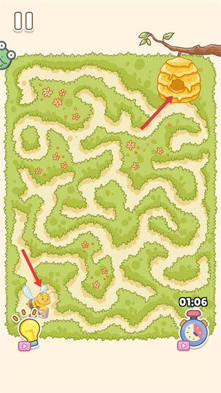 4、在迷宫关卡中,操控蜜蜂向目标【蜂巢】移动,同时留意【01:06】倒计时,规划路径通关。