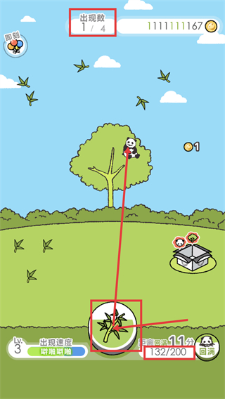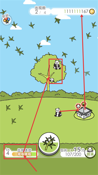 2、当【出现速度-Lv.3-唔唔唔】时,点击【竹叶】按钮提升产出,同时收集树上熊猫对应的【金币-1】奖励,推进【出现数-1/4】进度。