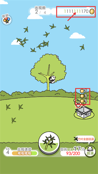 4、观察到【金币-111111170】增长时,小屋旁会出现多枚金币,持续点击【竹叶-93/200】按钮,维持产出以积累更多收益。