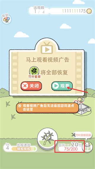 1、点击【观看】视频广告可恢复全部【竹叶能量】,弥补【竹叶-75/200】的不足,配合【出现数-1/4】进度维持熊猫产出节奏。