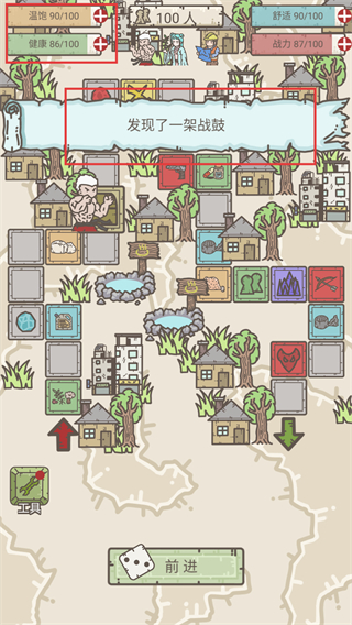 4、在探索过程中,留意资源发现提示(如“发现了一架战鼓”),解锁更多探索区域。