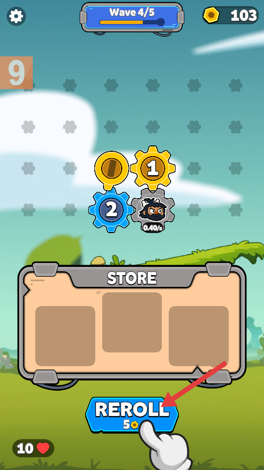 3、点击【REROLL】,花费5金币刷新配置,优化战力组合。