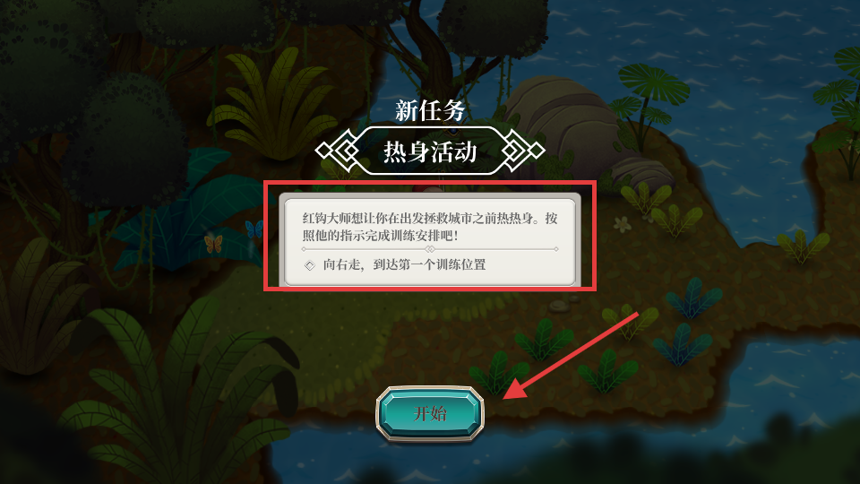 2、接取【热身活动】新任务后,按指引向右走至首个训练点,点击下方【开始】按钮开启训练流程。