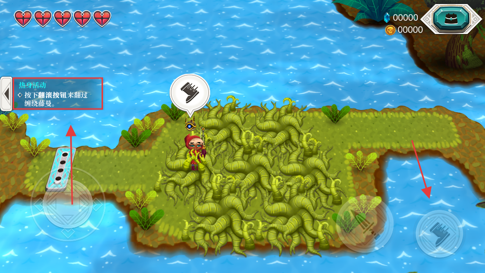 4、被【缠绕藤蔓】缠住时,按界面提示用翻滚技能翻过藤蔓,继续推进【热身活动】任务进程。