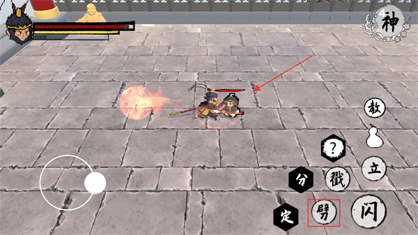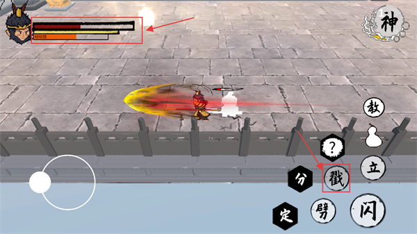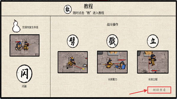 2、查看游戏教程掌握【劈】-【戳】-【立】等战斗操作,了解闪避与回血技巧,为后续对战做好充足准备。