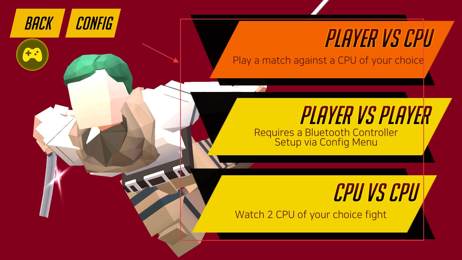 1、在模式选择界面,优先选【PLAYER-VS-CPU】,可自主选择CPU对手进行对战,适合练习连招,【CPU-VS-CPU】则为观战模式。