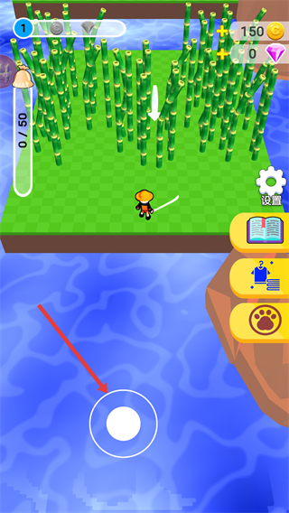 1、操控下方圆形按键移动角色,在竹林区域砍伐竹子,积累资源进度。