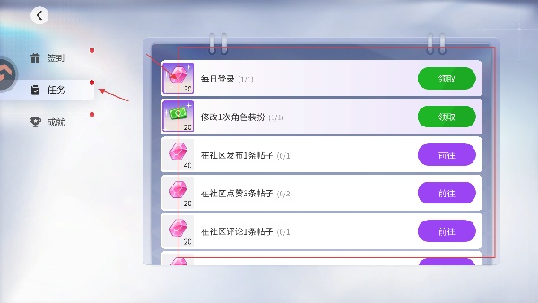 1、在任务界面点击【领取】,获取【每日登录】【修改1次角色装扮】的奖励,完成基础任务积累资源。