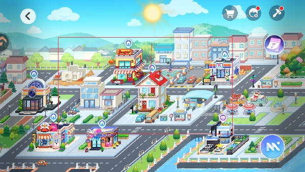 2、进入城镇场景后,可互动不同建筑(如汉堡店、住宅),解锁场景功能,推进城镇探索与角色互动流程。