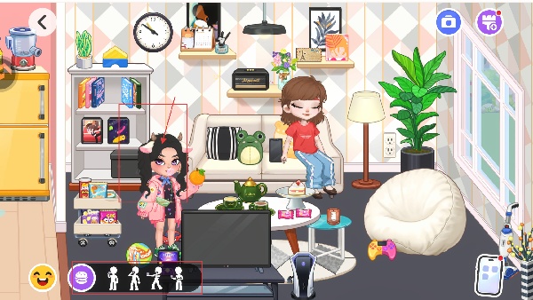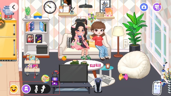 3、在室内场景中,通过底部动作按钮切换角色动作,与场景物品(如沙发、摆件)互动,丰富休闲体验。
