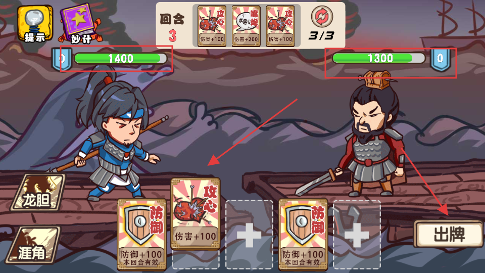 4、持续关注双方的血量变化,根据剩余手牌和卡牌效果,点击【出牌】按钮,执行出牌操作,逐步消耗敌方血量,争取对战胜利。